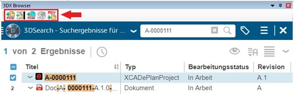 Étant donné que les concepteurs et ingénieurs ne doivent plus quitter l’environnement Eplan pour s’acquitter de leurs tâches classiques, on peut également s’attendre à une augmentation significative de l’efficacité dans leur travail quotidien avec le logiciel. Des boutons pratiques dans le navigateur 3DX intégré (voir image ci-dessous) aident les utilisateurs et les orientent intuitivement vers les fonctions les plus importantes :