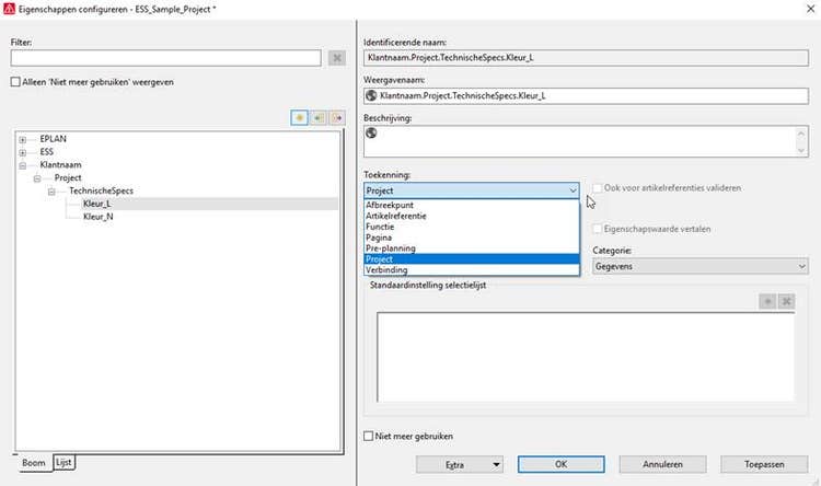 - De toekenning: voor welk niveau in Eplan wordt deze eigenschap gebruikt.