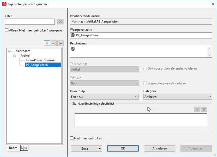 Via de knop ‘Extra’ onderaan het scherm kunt u vervolgens uw nieuwe eigenschap eenvoudig configureren. Een voordeel van deze nieuwe manier van werken is dat het u meer flexibiliteit biedt, zo kunt u bijvoorbeeld extra velden kiezen.