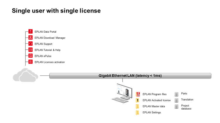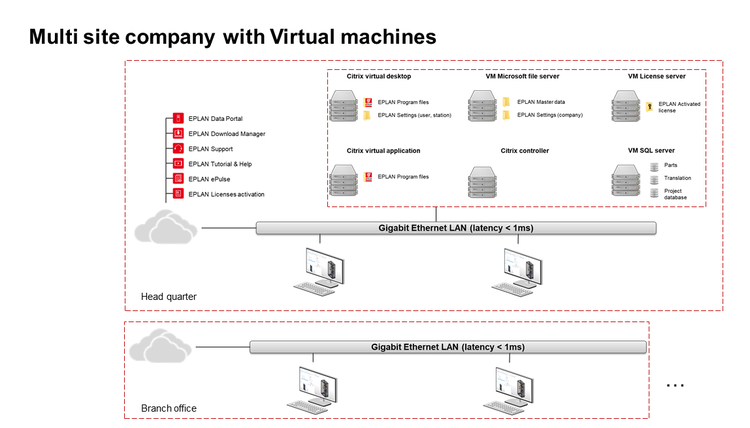 De Eplan-software wordt in dat geval in een serveromgeving geïnstalleerd, de gebruiker kan hierop inloggen en het beeld en de bediening van de virtuele machine overnemen vanop afstand. Het grote voordeel van deze setup is dat de vertraging (latency) tussen de Eplan-software en de data en database zeer klein is, wat ten goede komt aan de performantie van de software. Voor deze setup is een netwerklicentie vereist.