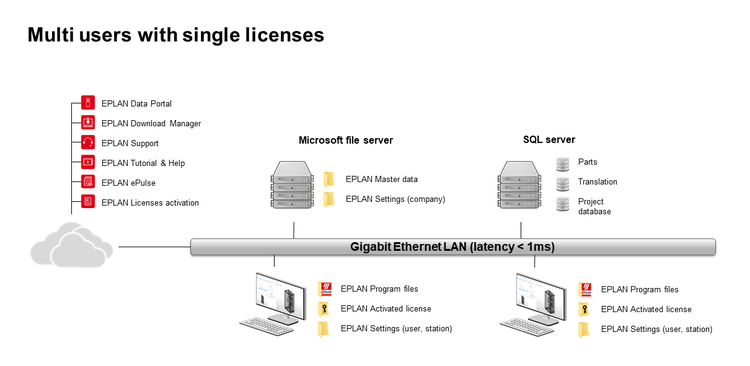 Wat uw noden en wensen ook zijn, om vlot met Eplan te kunnen werken heeft u een aantal zaken in elk geval nodig: een Eplan-licentie, de Eplan-software, data opslag (Microsoft file server) en een database (SQL). Ontdek hieronder welk type licentie, data opslag en database het meest geschikt is voor uw situatie.