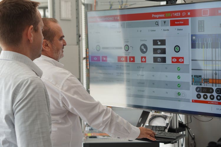 V další fázi využívá pracovník výroby nástroj Eplan Smart Wiring, který ho intuitivně a krok za krokem navádí, jak, kde a kudy zapojit připravené kabely. V nástrojích Eplan Smart Mounting i Smart Wiring pracovník potvrzuje každý provedený krok, díky čemuž je možné sledovat rozpracovanost výroby rozváděčů v reálném čase. Pokud je třeba, pracovník výroby navíc může přidat k neprovedenému úkonu komentář s odůvodněním, proč k tomuto kroku nedošlo, a pokračovat dalším krokem v pořadí. Tím se zvyšuje efektivita celé výroby. Jakmile se osadí veškeré potřebné součásti, v závěrečné fázi se celý rozváděč otestuje z hlediska správné funkčnosti veškerých spojů. Výrobní cyklus rozváděče se uzavírá přiložením potřebné dokumentace a v tuto chvíli už je rozváděč připravený k expedici.