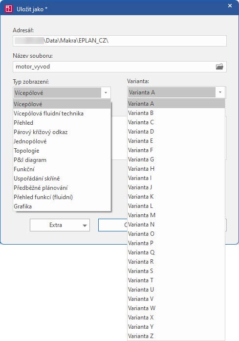 Jak už bylo zmiňováno, makra jsou soubor – nejprve je tedy třeba zvolit adresář a název souboru. Doporučujeme ukládat makra do kmenových dat Eplan (složka Data\Makra). Toto je výchozí adresář, na který se dá později odkazovat zkratkami z databáze artiklů, ale hlavně se automaticky načítá do centra vkládání.