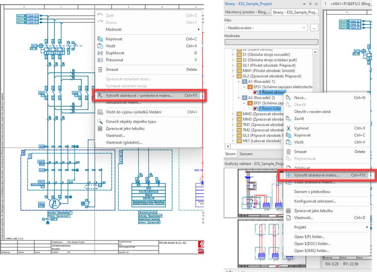Makra se vždy vytvářejí na základě už existujícího schéma. Ať už makra okénková nebo stránková, vždy je třeba vybrat symboly (strany) a z kontextového menu vybrat Vytvořit…