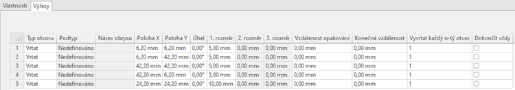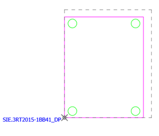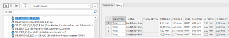Pokud se jedná o přístroje, které se připevňují přímo na montážní desku, na bočnice skříně, nebo na dveře, budeme potřebovat doplnit k artiklu ještě příslušné vrtací zobrazení. Pokud je vrtací šablona přístroje jednoduchá, lze ji definovat přímo v databázi artiklů pomocí tabulky, kde zadáme typy výřezů a souřadnice jejich středů. Popis rozměrů jednotlivých typů výřezů je uveden v nápovědě, kterou můžete aktivovat klávesou F1. Důležité je vědět, kde najdeme počátek souřadnic pro jednotlivé výřezy. Pokud zobrazíme 3D model přístroje v pohledu shora a vytvoříme k němu opsaný obdélník, tak jeho levý dolní roh je bod 0,0.