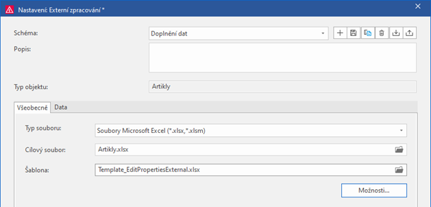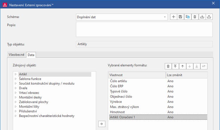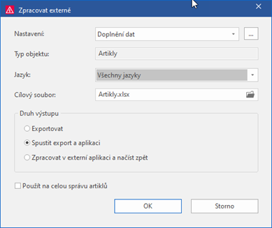 I na tuto možnost Eplan myslí, a proto je ve správě artiklů k dispozici funkce Zpracovat vlastnosti externě. Funkci najdeme ve správě artiklů pod tlačítkem [Extra]. Data musíme nejprve vyexportovat do Excelu pomocí funkce Exportovat data. Zde je třeba nastavit typ souboru, název cílového souboru a šablonu Tempate_EditPropertiesExternal.xlsx. Ve druhé kartě dialogu pak data, která chceme exportovat a následně upravit.