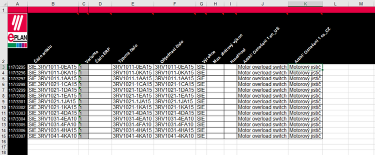 Nyní již máme vytvořené artikly a doplněné šablony funkcí. Pro doplnění nebo úpravy některých dalších údajů by se nám mohla hodit možnost hromadných úprav, ideálně pomocí nějakého obecně používaného nástroje. Zde se nabízí zpracování dat v tabulkách MS Excel. Data je možné upravovat hromadně, lze využít funkce pro vyhledávání a náhradu textu, případně i další pokročilé funkce Excelu. Navíc takto může data upravit téměř kdokoliv i bez znalosti prostředí Eplan a bez potřeby licence Eplan, která tak není během úpravy dat blokována. Takovéto zpracování by se hodilo například pro doplnění různých údajů, jako je hmotnost, maximální ztrátový výkon zařízení, číslo ERP, nebo pro úpravy překladů v popisech.