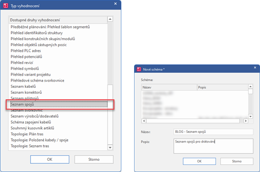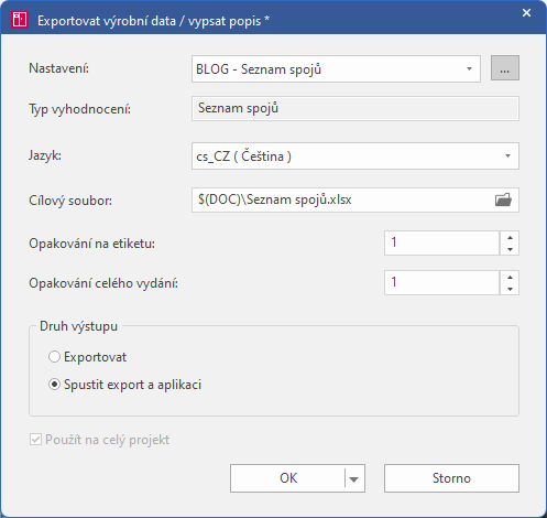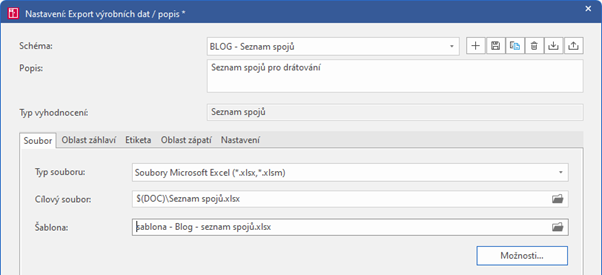 V následujícím dialogu zvolíme název schéma – doporučuji volit formát FIRMA – Seznam spojů, aby se snadno odlišily vaše exporty od standardních nebo třeba speciálně upravených pro konkrétního zákazníka.