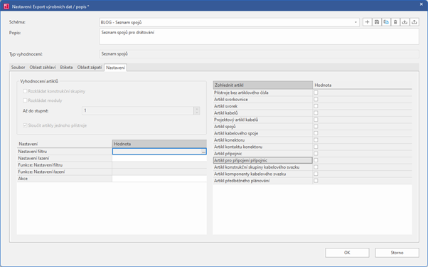 V poslední kartě Nastavení je možné např. vytvořit filtr – tedy exportovat jen spoje, které mají vyplněnou nějakou vlastnost apod. Osobně preferuji (kde je to možné, tedy kde je daná vlastnost exportována) filtraci až na úrovni Excelu.