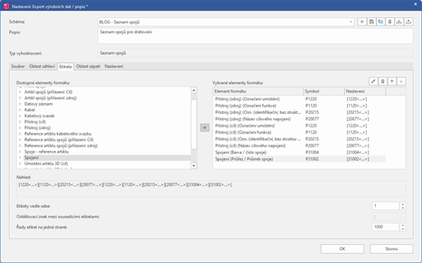 Dialog potvrdíme, čímž jsme se vrátili zpět do volby schéma, kde by mělo být naše nové schéma vybrané. Níže můžeme zvolit opakování na etiketu – opakování řádků – například pokud bychom každou návlačku tiskli hned dvakrát za sebou – a opakování celého vydání – např. pro výrobu dvou stejných rozvaděčů.