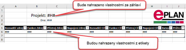 Zde můžete vidět vzor takové šablony, kde do buněk, ve kterých je zapsáno #H#, se zapíší vlastnosti projektu, které definujeme v kartě záhlaví, a místo ### se zapíší vlastnosti spojů, definované v kartě Etiketa.