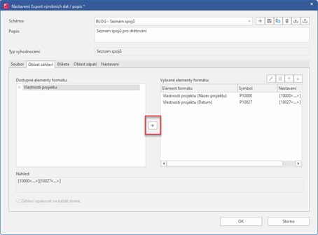 V levé části je tedy možné zvolit pouze vlastnosti projektu. Následně kliknutím na šipku vyvoláme dialog, kde vybereme, jakou vlastnost chceme vypsat, a potvrdíme. Pro tuto šablonu jsme tedy zvolili Název projektu a Datum (viz obrázek výše).