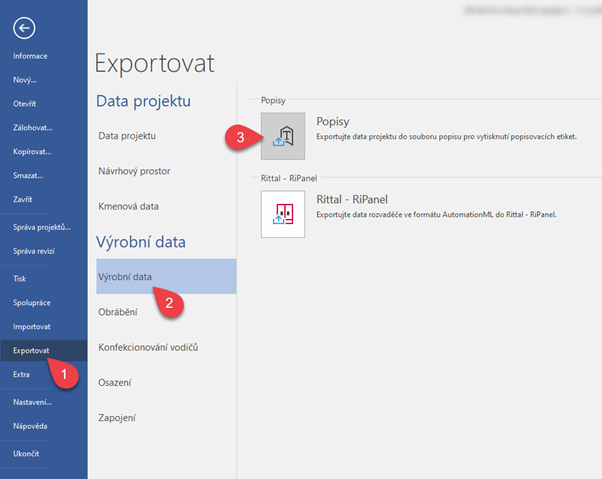 Pro Export a jeho nastavení musíme mít otevřený požadovaný projekt a následně v záložce Soubor > Exportovat zvolíme Výrobní data a Popis: