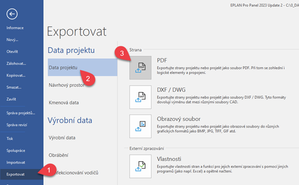 Nejprve otevřeme dialogové okno s nastavením v cestě Soubor > Exportovat > Data projektu > PDF.