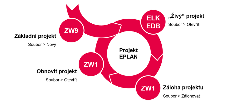 Poznámka: Eplan verze do 2.9 SP1 mimo základního projektu používala ještě šablonu (EPT). Ta se od základního projektu liší tím, že neobsahuje kmenová data, ale při zakládání projektu si je Eplan stáhne z nastavených adresářů.