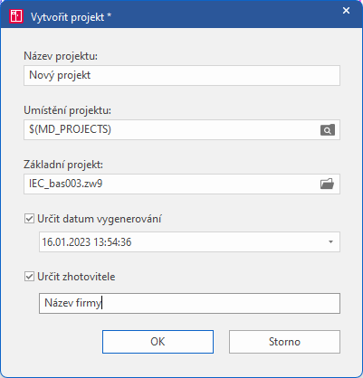 Umístění projektu lze také volit libovolně a na rozdíl od ostatních dat (rámečky, formuláře, symboly apod.) nemusí být ve standardním adresáři, který je zde reprezentován proměnnou cesty $(MD_PROJECTS). Tuto a jiné proměnné cest lze vložit z kontextového menu (pravé tlačítko myši).