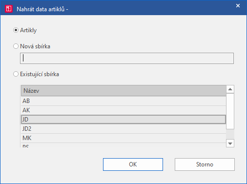 - Artikly je možné nahrávat individuálně nebo hromadně (celou databázi).