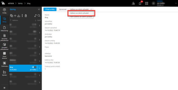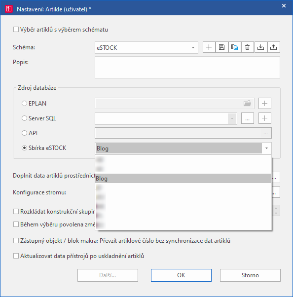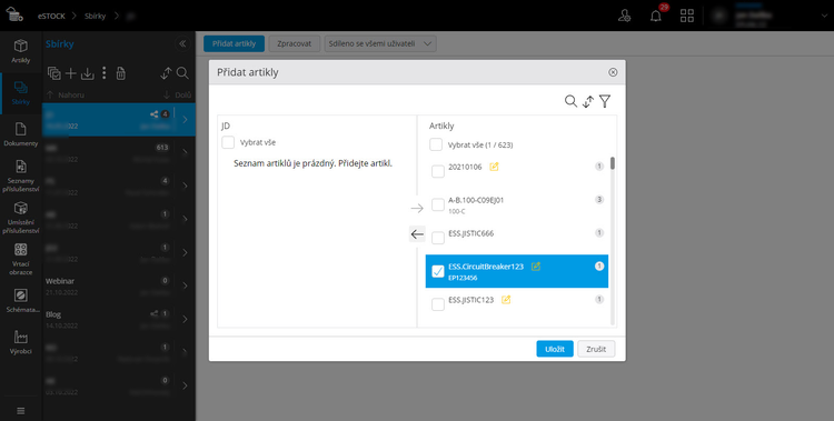 - Ke každému artiklu je možné přiřadit libovolný počet sbírek a sdílet ho vždy s konkrétními projektanty používající danou sbírku. Kmenová data otevřete v prostředí Electric P8, Pro Panel či Fluid– Artikly – Nastavení a sbírku eStock připojíte.
