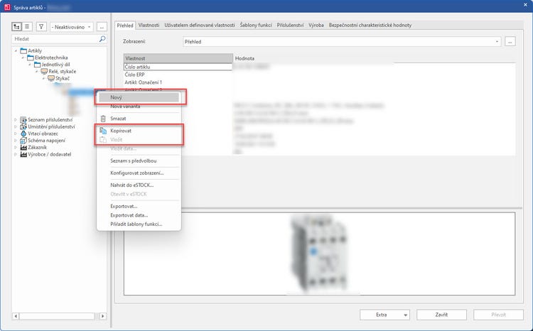 Zde lze v levé části vybrat správnou kategorii (pokud není zatím založena, lze ji později změnit) a vybrat „Nový“ z kontextového menu, případně kopírovat/vložit podobný artikl, a upravit mu data tak, aby odpovídala nové položce.
