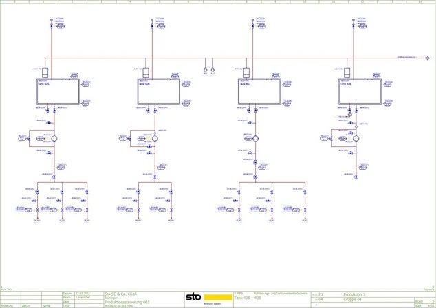 Tanks und die verbundene Instrumentierung im Fließschema von Eplan Preplanning: Werden Rezepturen geändert, muss Sto regelmäßig Umbauarbeiten vornehmen, um die Anlage entsprechend anzupassen.
