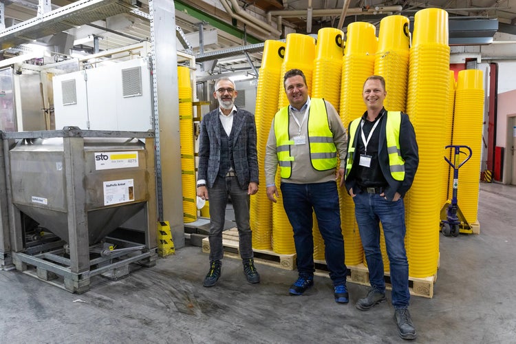 Joachim Hauschel (Sto), Klaus Lechtenbörger (Eplan) und Ronny Kaltschmid (Kaltschmid Industrial Engineering – v.l.) freuen sich, dass die Anlage in Stühlingen die charismatischen gelben Sto-Eimer dank der Engineering-Lösungen von Eplan noch effizienter befüllt.