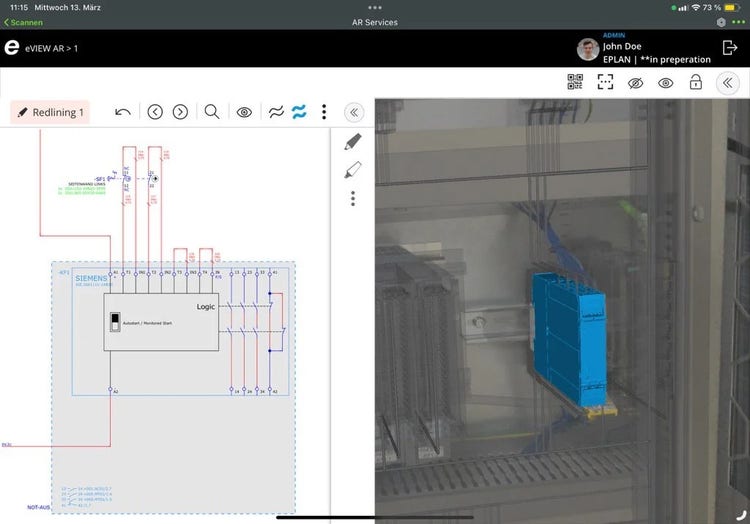 Zurück zu unserem Servicetechniker, der den Defekt im Schaltschrank nun behoben hat. Um seine Änderungen zu dokumentieren und die zukünftige Arbeit an diesem Schaltschrank zu erleichtern, hinterlegt er Notizen und Vermerke direkt in der Eplan eView AR Software. Durch die Redlining- und Greenlining-Funktion gelingt eine langfristige und akkurate Dokumentation.