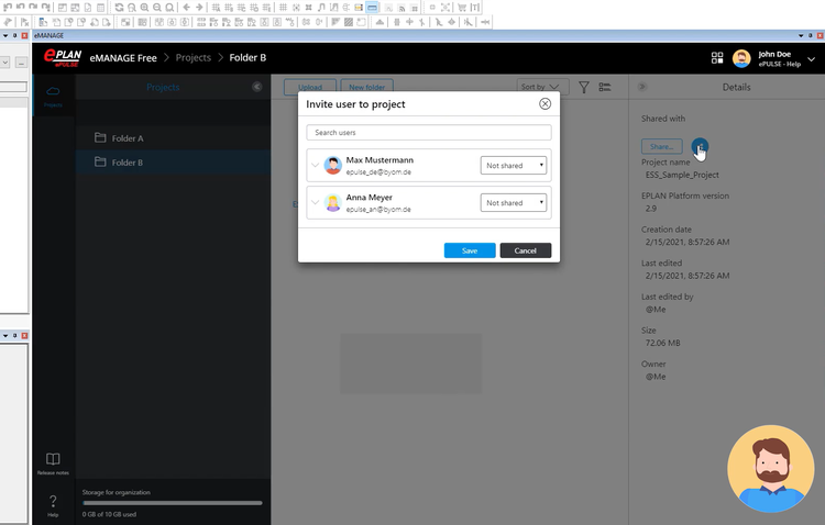 Werden die Projekte stattdessen mit eManage in die Cloud-Umgebung Eplan ePulse hochgeladen, gibt es eine übersichtliche Single Source of Truth für alle Projektbeteiligten mit klar definierbaren Zugriffsrechten. Berechtigte Stakeholder können mit eManage die Projektdaten auch herunterladen, zum Beispiel im Rahmen einer finalen Projektübergabe mit Kunden.
