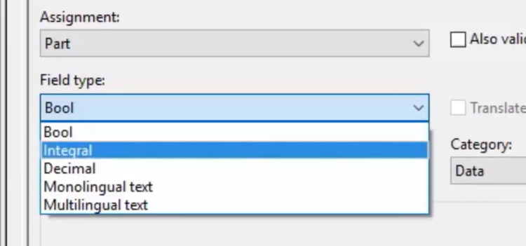 Mit Hilfe des neuen Pull-Down-Menüs "Feldtyp" ("Field type") bestimmen Sie die Zeichen und das Format für die benutzerdefinierten Eigenschaften. Mögliche Feldtypen sind zum Beispiel: Bool, Dezimalzahl oder mehrsprachiger Text (siehe Bild unten).