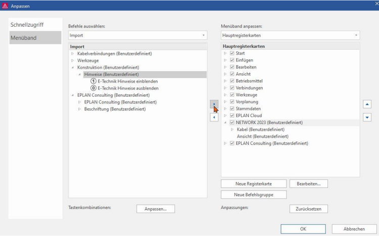 Ausgewählt und importiert werden können sowohl Befehlsgruppen und Registerkarten als auch einzelne Befehle, wobei letztere analog den Vorversionen nur in eine benutzerdefinierte Befehlsgruppe eingefügt werden können. Mittels der Aktion MfImportRibbonBarAction kann zudem ein komplettes Menüband importiert werden. Dabei werden die vorhandenen Anpassungen des Menübands überschrieben. Mehr zum Thema Menübandimport erfahren.