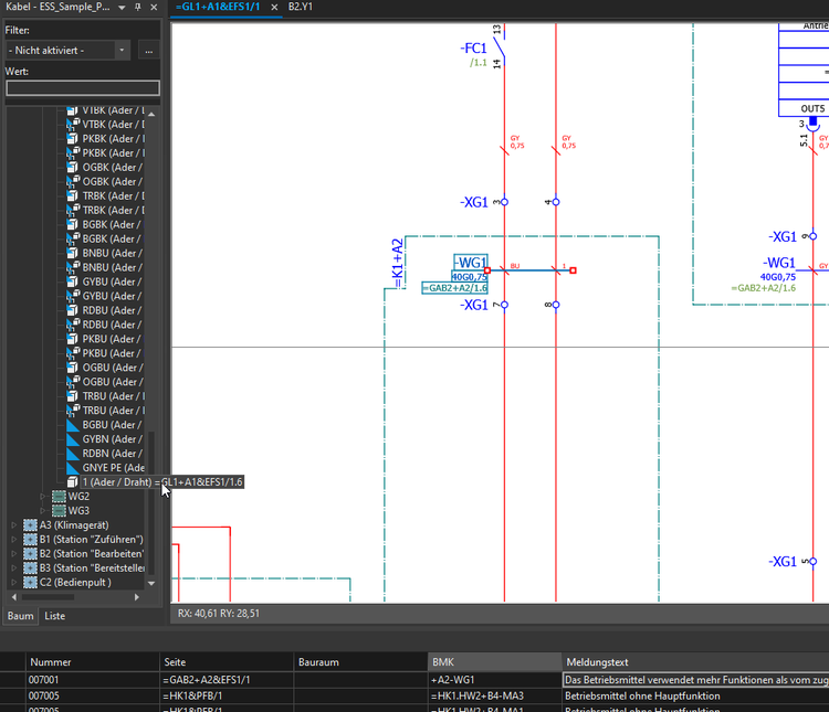 Sind alle Kabel auf Klemme gelegt oder existieren noch offene Verbindungen? Visiert ein Kabel mehrere Ziele an oder werden Adern genutzt, die das Kabel gar nicht hat? Bereits der Basis-Prüflauf kontrolliert, ob eingesetzte Betriebsmittel mehr Funktionen verwenden, als der zugehörige Artikel bereitstellt. Und auch wenn Betriebsmitteln die Hauptfunktion fehlt, gibt Eplan einen Fehler aus. Beispielsweise wenn ein Schütz zwar Kontakte aufweist, die Spule aber nicht verdrahtet ist.