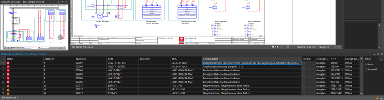 Neben der Kategorie zeigt die Meldungsverwaltung eine sechsstellige Meldungsnummer an. Dabei bezeichnen die ersten drei Ziffern die Klasse, zu der die Meldung gehört. Beispielsweise gibt die Ziffernfolge „001“ an, dass die Meldung eine Klemme betrifft, während die Ziffernfolge „501“ auf ein Problem bei den Artikelstammdaten hinweist. Die letzten drei Ziffern der Meldungsnummer dienen der eindeutigen Identifizierung einer Meldung innerhalb einer Klasse. Das vereinfacht Ihnen die Kommunikation mit Ihrem Lieferanten, wenn Sie sich über Fehler oder Qualitätslücken im Schaltplan austauschen.