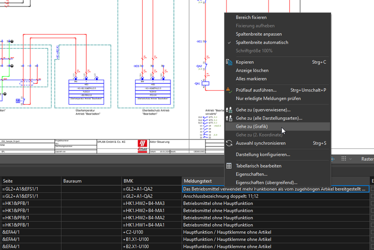 Sie folgen dem Motto ‚Probleme sind da, um sie zu lösen‘? Klicken Sie eine Meldung an und wählen Sie im Menü „Gehe zu (Grafik)“. Eplan springt dann direkt zur entsprechenden Stelle im Stromlaufplan. Bevorzugen Sie Shortcuts, ist [STRG] + [J] die Tastenkombination Ihrer Wahl.
