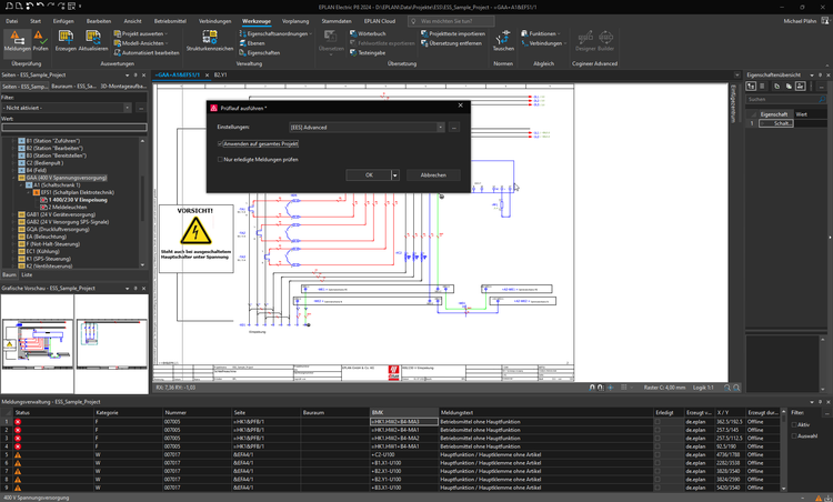 Bei einem Prüflauf handelt es sich um einen automatisierten Kontrollgang: Stoßen Sie ihn in Eplan an, rennt die Software los und analysiert, ob die Stromlaufpläne Ihrer Anlage formal korrekt sind. Stellt Eplan dabei formale Fehler in Ihrem Stromlaufplan fest, erhalten Sie prompt eine Meldung. Einige Zulieferer werben in ihren Referenzen dementsprechend gerne damit, dass der Prüflauf eines abgeschlossenen Projekts „meldungsfrei“ war.