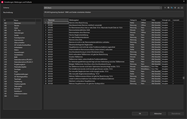 - Der Prüflauf [EES] Expert baut auf den anderen beiden auf und umfasst darüber hinaus zusätzliche Meldungstexte; beispielsweise zu Kabellängen oder Verlegewegen. Dies ist insbesondere interessant, wenn Sie Prüfläufe für Ihren Digitalen Zwilling in 3D nutzen möchten.