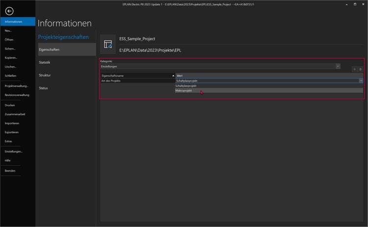 Sie sehen also: Das Arbeiten mit Markos birgt viele Potenziale und ist der richtige Weg für das automatisierte Erstellen von Schaltplänen. Arbeitet man viel mit Makros, kennt man die Herausforderung hinsichtlich Namensgebung und dem Wiederfinden. Erleichterung bringt hier die Erstellung von Makroprojekten. Denn Makroprojekte werden in Eplan zum Verwalten und vereinfachten Erstellen von Makros verwendet. Die jeweilige Projektart (Schaltplan- / Makroprojekt) wird in den Projekteigenschaften mittels der Eigenschaftart des Projekts festgelegt.