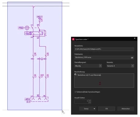 Nur feine Nuancen unterscheidet das Seitenmakro. Nehmen wir als Beispiel ein Seitenmakro für eine komplette Einspeisung. Da in diesem Fall, die gesamte Seite aus einer oder mehreren "echten" Seiten, inkl. Seitenkopfdaten besteht und 1:1 als Makro abgespeichert wird, gibt es hier nicht die Möglichkeit Varianten zu definieren. Je nach Anforderung können 1 bis x Seitenmakros bei der Schaltplanerstellung eingefügt werden. Ideal für wiederkehrende Schaltplanseiten, denn Fehler werden so durch die Makroerstellung nahezu ausgeschlossen. Bei all diesen Möglichkeiten werden eingelagerte Bilddateien im jeweiligen Makro mit abgespeichert.