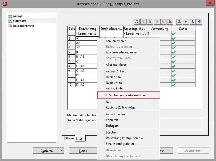 Im Dialog Kennzeichen (Projektdaten > Strukturkennzeichen-Verwaltung) steht im Eplan Projekt der Kontextmenüpunkt In Suchergebnisliste einfügen zur Verfügung. Dieser überprüft die Verwendung der markierten Strukturkennzeichen und trägt die gefundenen Objekte automatisch in die Suchergebnisliste ein.