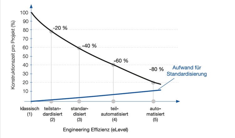 Die Studie Engineering 4.0 von Eplan und dem European 4.0 Transformation Center der RWTH Aachen teilt den Weg vom manuellen bis hin zum voll automatisierten Engineering in fünf Stufen auf, die sogenannten eLevel. Dabei werden enorme Potenziale erkennbar, die einen oder mehrere Level-Aufstiege für Unternehmen mit sich bringen. So kann im Vergleich zu einer konventionellen Schaltplanerstellung durch die Nutzung eine Schaltungsbibliothek für Produktfunktionen (Stufe drei) eine Zeitersparnis von 40 Prozent realisiert werden, durch eine Teilautomatisierung (Stufe vier) sogar von 60 Prozent. Natürlich bedeutet „aufleveln“ dabei auch, zunächst erstmal Aufwand in die Standardisierung von Prozessen stecken zu müssen. Das lohnt sich laut Studie für die meisten Unternehmen aber – auch bis in hohe Effizienzstufen (siehe Abbildung).