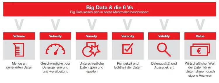 Daten sind das neue Öl. Als Rohstoff ist es wertvoll. Doch wenn es nicht raffiniert ist, lässt sich mit ihm wenig Brauchbares anfangen. Es muss erst in Benzin, Kunststoff oder Ähnliches umgewandelt werden, um einen Nutzen zu erzeugen. Genauso verhält es sich mit Daten: Nur wer sie strukturiert und in einen Kontext setzt, kann aus Big Data smarte Informationen gewinnen. Big Data heißen die großen Datenmengen, die sehr divers sind und rasch anwachsen. Ihr Charakter folgt den drei grundlegenden Vs: „Volume“ definiert die enormen Mengen. Ihre Vorkommen sind so komplex, dass sie sich mit herkömmlichen Methoden nicht mehr analysieren lassen. „Velocity“ bezeichnet die Geschwindigkeit, mit der die Daten generiert und weiterverarbeitet werden. „Variety“ bezieht sich auf die Vielfalt an Datentypen und deren Quellen. Mit den weiterführenden Vs „Veracity“, „Validity“ und „Value“ ergeben sie die sechs Vs als entscheidende Merkmale von Big Data.