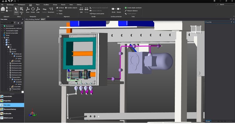 Mit diesen Informationen werden die externen Betriebsmittel in der 3D-Umgebung positioniert, Kabelwege systemgestützt definiert und die Kabel anschließend geroutet. Wurden alle Betriebsmittel und Kabel eingebracht, erhält der Konstrukteur einen digitalen Zwilling der gesamten Verkabelung. Dieser Zwilling hat jetzt zweifache Wirkung: Er kann als 3D-Baugruppe der mechanischen Konstruktion bereitgestellt werden oder mit den ergänzten Kabelinformationen in das elektrotechnische Projekt übertragen werden.