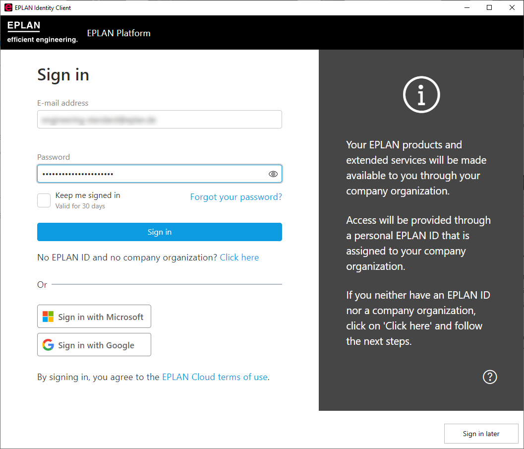 Mit Ihrem Azure Microsoft-Konto könen Sie sich anmelden, wenn Sie sich zuvor einmal erfolgreich über Ihre EPLAN ID angemeldet haben. Die Einrichtung für eine Anmeldung mit Ihrem Microsoft-Konto findet in Ihrem EPLAN Konto statt.