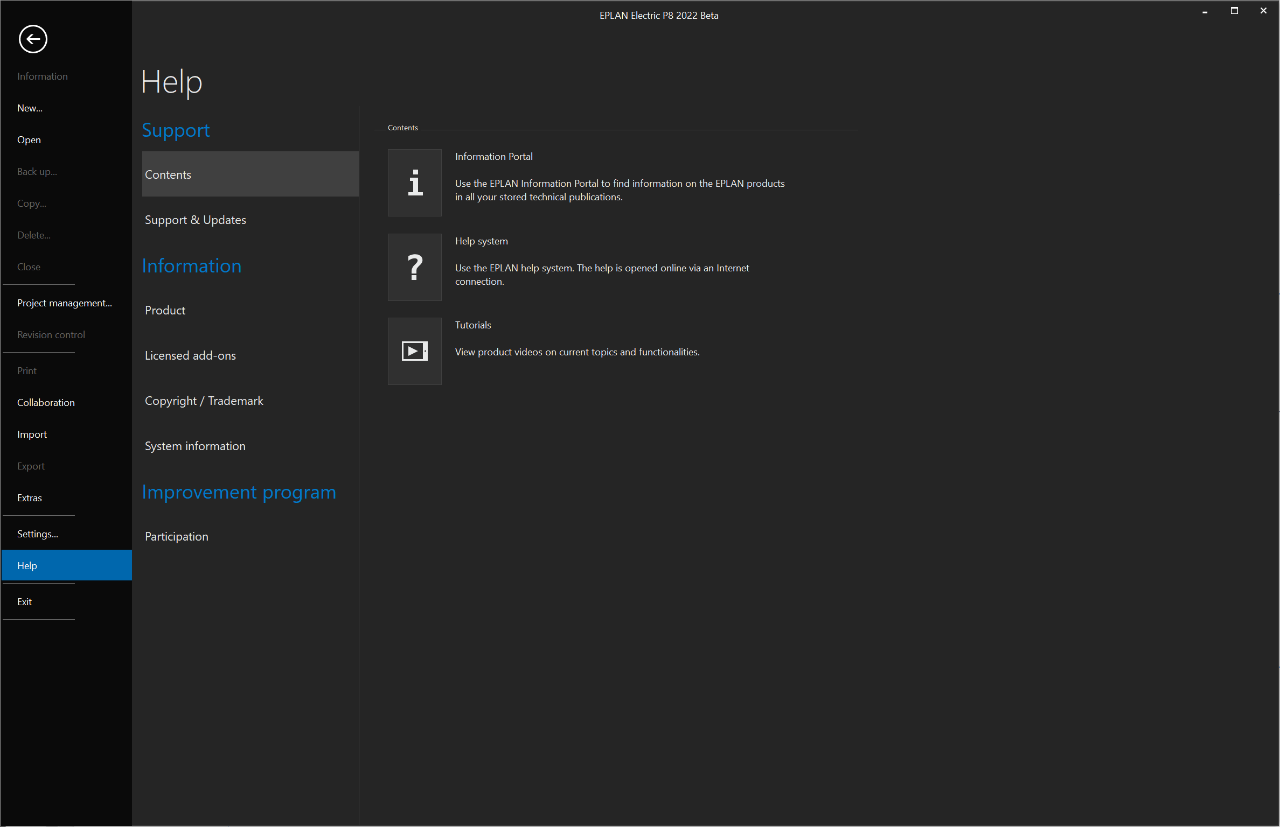 - Tutorials: Launches an EPLAN website with video tutorials on various topics.