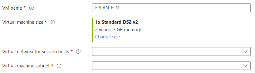 • Underneath, enter the VM name. EPLAN-ELM is predefined, but can be changed. The VM name may only contain letters, digits or dashes and cannot be longer than 15 characters. The virtual machine size is set to a DS2_v2 and cannot be changed.