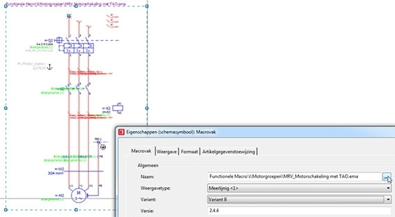 Een macro is niets anders dan een stukje tekening, een deelschema dat je hergebruikt. Een verzameling elektrische componenten die bij elkaar horen, zoals een motorstarter voor een transportband. Die bestaat uit een contactor, een beveiliging, klemmen en daarop aangesloten een motor met een kabel. Wanneer we voor zo’n vaak terugkerend deelschema een macro maken, hoeven we dit wiel niet iedere keer opnieuw uit te vinden. Zo bespaar je met macro’s dagelijks zeeën van tijd.