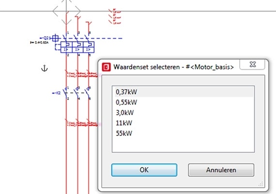In het voorbeeld van de motorstarter voor een transportband kunnen we een algemene macro maken waar we later de juiste artikelen met de hand in vullen. Of we maken losse macro’s voor bijvoorbeeld verschillende motorvermogens. Maar het kan nog slimmer: door één macro te maken en waardensets te gebruiken. Een waardenset is eigenlijk een keuzelijst van waarden met bijbehorende varianten. Met behulp van zo’n waardenset kunnen we niet alleen de componenten, maar bijvoorbeeld ook de teksten en de kleur van een indicatielampje vastleggen.