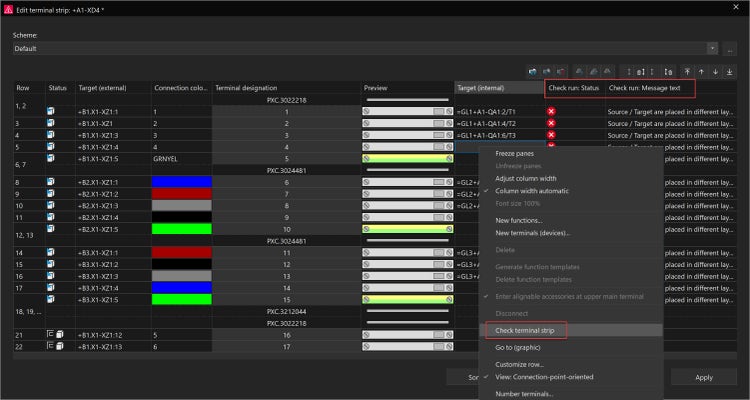 Another important point is to check and validate the terminal strip and, if necessary, correct errors. In the 2024 version, both steps have been optimized by simplifying user access. With the newly added context menu item Check Terminal Strip, users have the option of checking their current Terminal Strip directly without having to exit the dialog. The command opens the Check Project dialog with the preset scheme for terminal test runs, which can also be adjusted or replaced if necessary. Designers get faster results and can react faster.