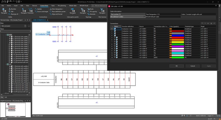 In version 2024, such spare conductors can be easily and cleanly handled using the new Connect Cable Connections command. If the designer launches the command, the software automatically creates and connects the spare conductors of the cables. The spare terminals required to land the conductors are also automatically generated. This not only ensures that all spare conductors of a cable are connected to spare terminal but also that errors in project planning and evaluations can also be avoided.