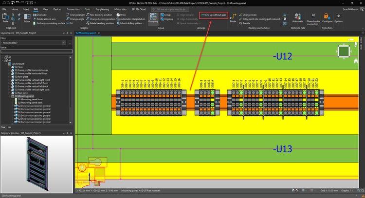 Many users are familiar with this: Due to the incorrect placement or subsequent removal of assembled devices and components, gaps arise on DIN or profile rails during the 3D control cabinet construction. In the 2024 version, these can be easily closed automatically, eliminating manual rework or time-consuming postponement actions. Users can find the new Line Up Without Gaps command in the Edit tab in the Arrange command group. If the command is executed, it removes gaps and places 3D parts placements together and ensures order and overview on the DIN rail without manual effort.