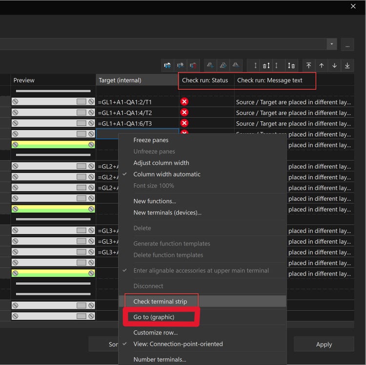 By checking the terminal strip directly in the dialog, the designer can immediately see whether they need to go back to the schematics to make adjustments. This is a working step that is much faster in the new version 2024, as users now have access to the Go to (graphic) command familiar from other dialogs in the context menu. This closes the Edit Terminal Strip dialog and jumps directly to the selected object in the Graphical Editor, which makes it much faster to find and correct terminals.