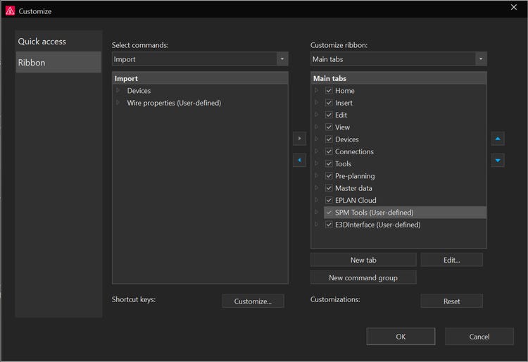 The ribbon in the new Eplan version 2024 can easily be expanded with selected tabs, command groups or individual functions, which enables an individual and clear management of the functions in the ribbon bar. Previous adjustments in the current ribbon will be retained. The import is simply imported by right-clicking on the context menu item Import Ribbon. Command groups and tabs can be selected and imported, as well as individual commands, whereby the latter can only be inserted into a user-defined command group, similar to the previous versions. The new Ribbon Bar Action can also be used to import an entire ribbon. This will overwrite the existing customizations of the ribbon.
